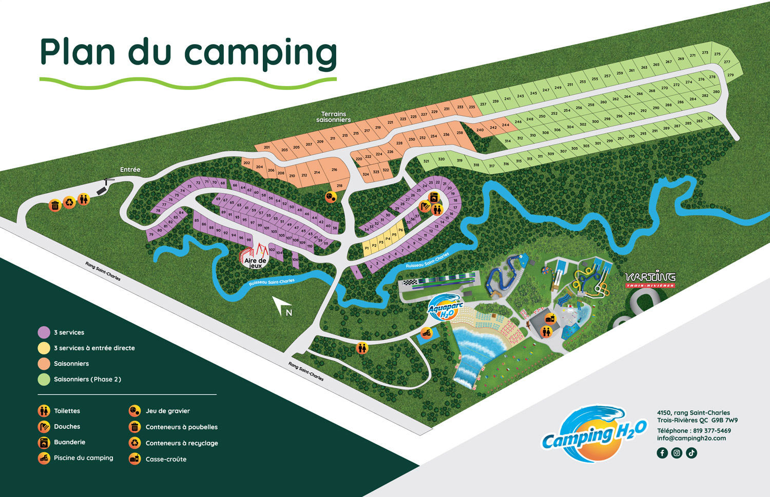 Utiliser la carte du site pour choisir l’emplacement qui vous conviendra le mieux. Vous y trouverai également l’emplacement des différents services.